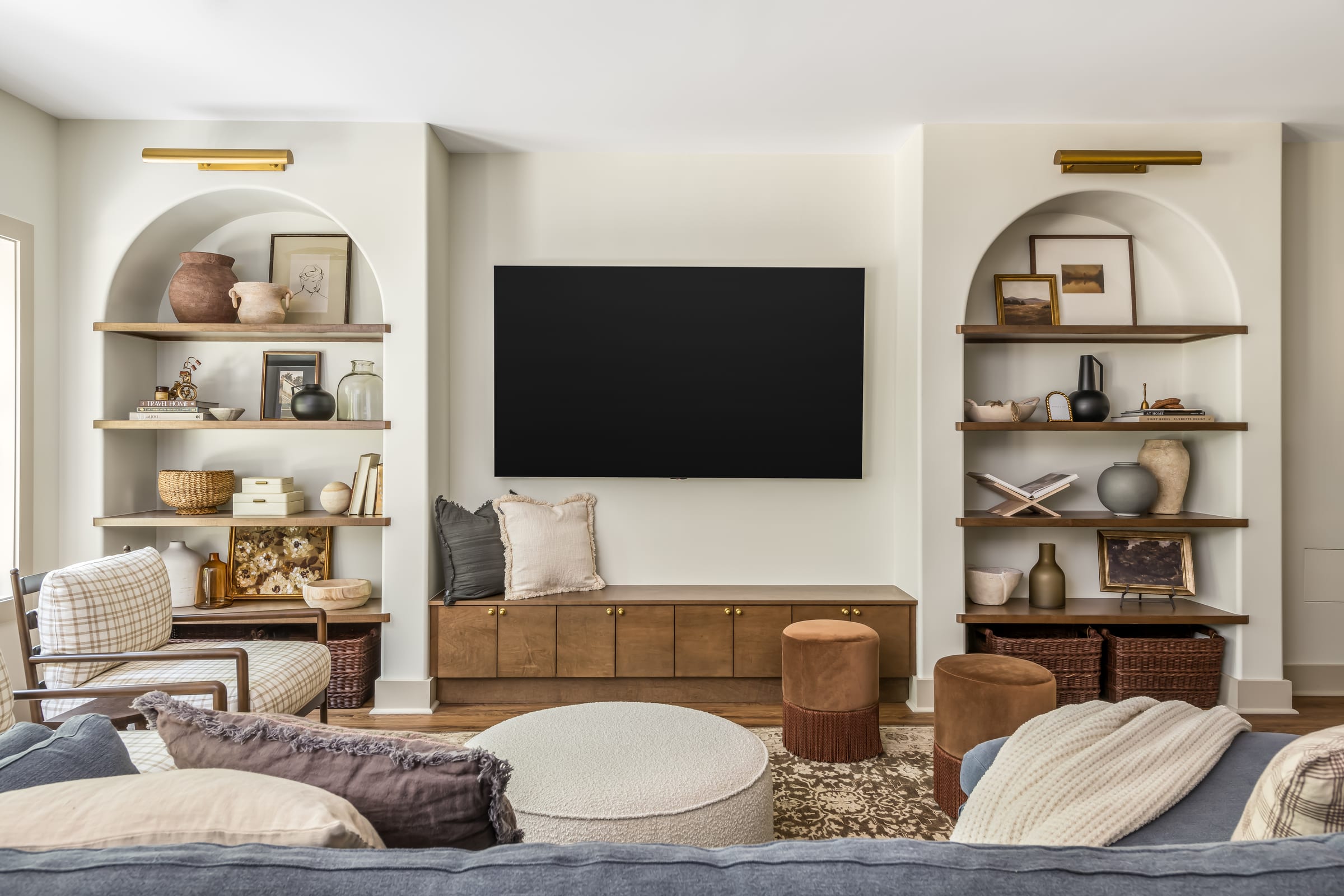 Post Oak began as an unfinished basement and evolved into a warm, deeply personalized retreat shaped through a close collaboration between our team and the homeowner, who is an interior designer. Together we transformed the raw space into a highly functional extension of the home with custom cabinetry and built-ins, a hidden workshop with an integrated gym, and a sculptural iron and brass railing that anchors the new architecture. Technology is seamlessly integrated with a stealth invisible surround system that preserves the clean, Shea McGee–inspired aesthetic the homeowner envisioned. The result is a refined lower level that blends beauty, comfort, and modern performance, crafted to support daily living with the elevated feel of a fully designed home.